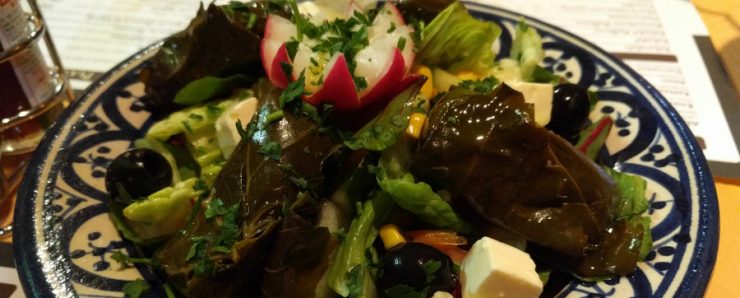 El primer plato tarda poco en llegar y abrimos boca con la dolma y los paquetes de hoja de parra rellenos de arroz, que son sabrosos y están perfectos entre la ensalada.